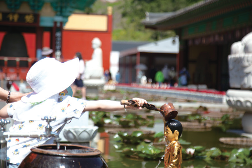 만불사 관욕대에서 한 어린이가 아기부처님을 씻겨드리 고 있다.