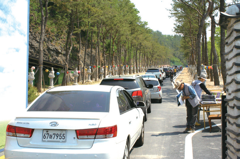 부처님오신날 만불사를 방문하기 위해 줄서있는 차량들 과 방문객들의 모습 ①
