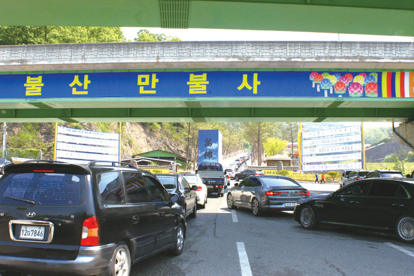 부처님오신날 만불사를 방문하기 위해 줄서있는 차량들 과 방문객들의 모습 ②