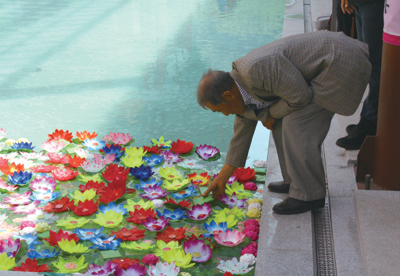 만불사 향수해 연꽃장식을 만지고 있는 불자님의 모습 > 행사안내